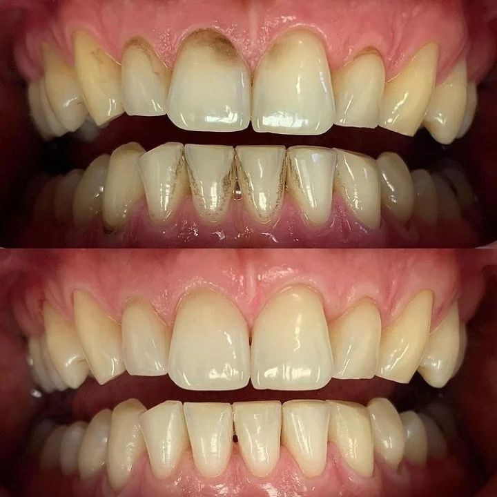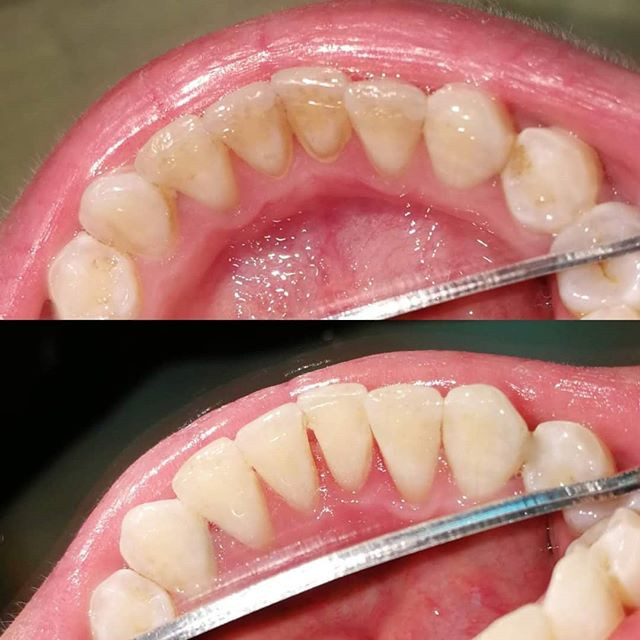 Процедура избавляет от твердого налета и камня, также от коричневых и черных пятен от чая и кофе.