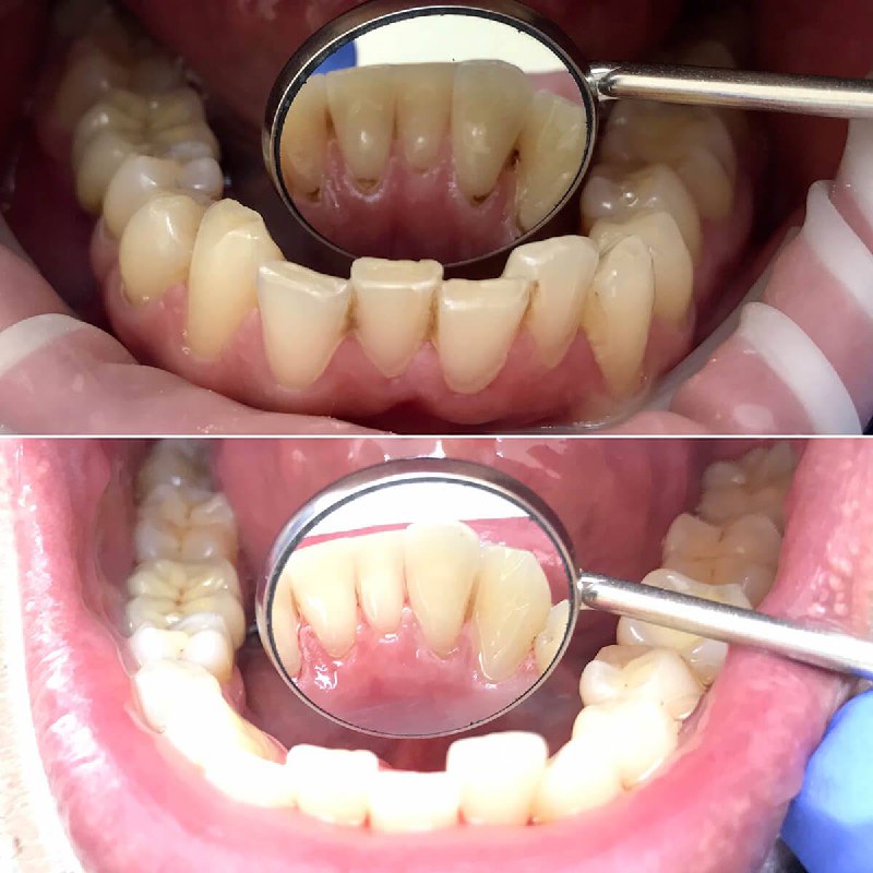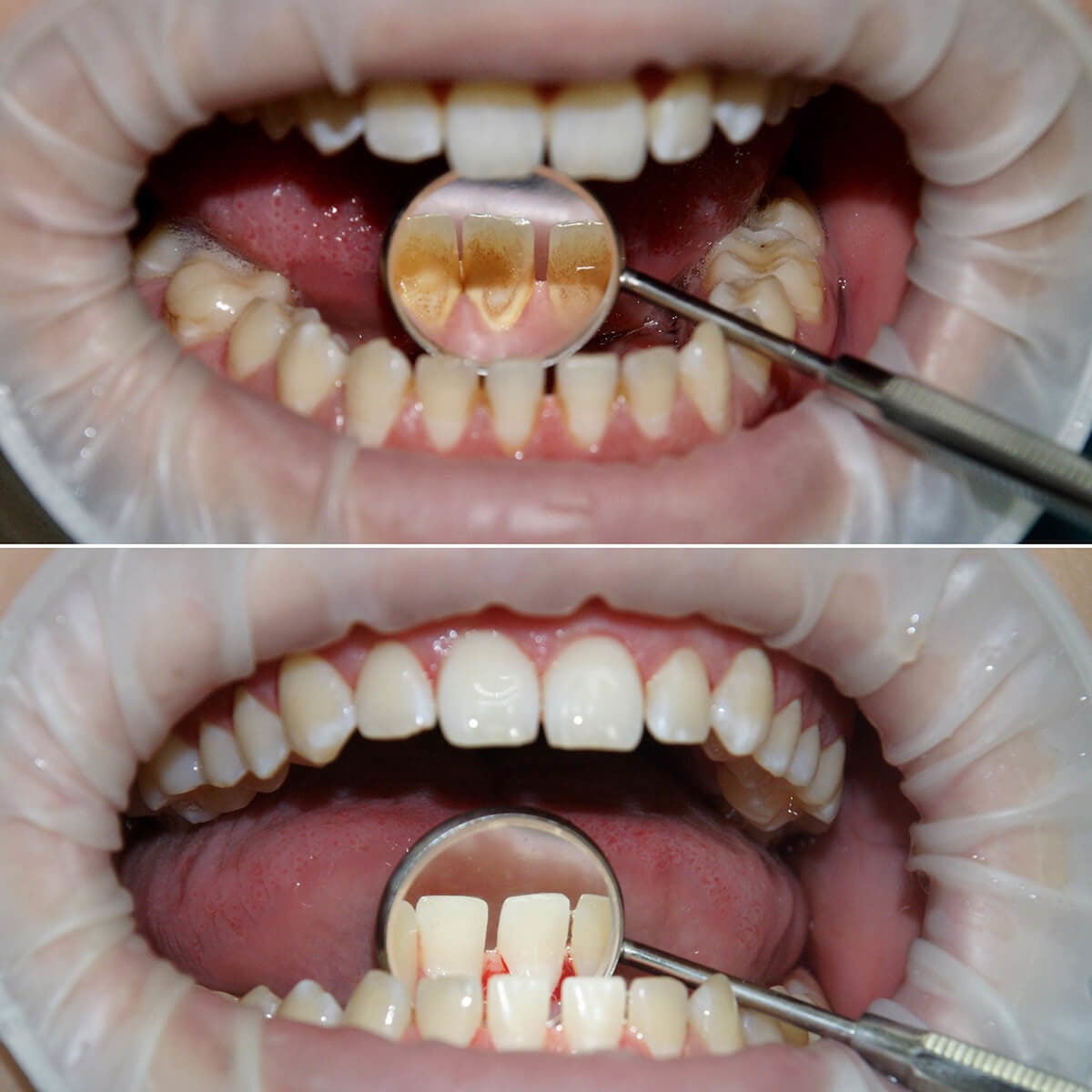 Происходит бережное снятие зубных отложений без повреждения эмали. При высокой чувствительности зубов, возможно использование аппликационной анестезии.